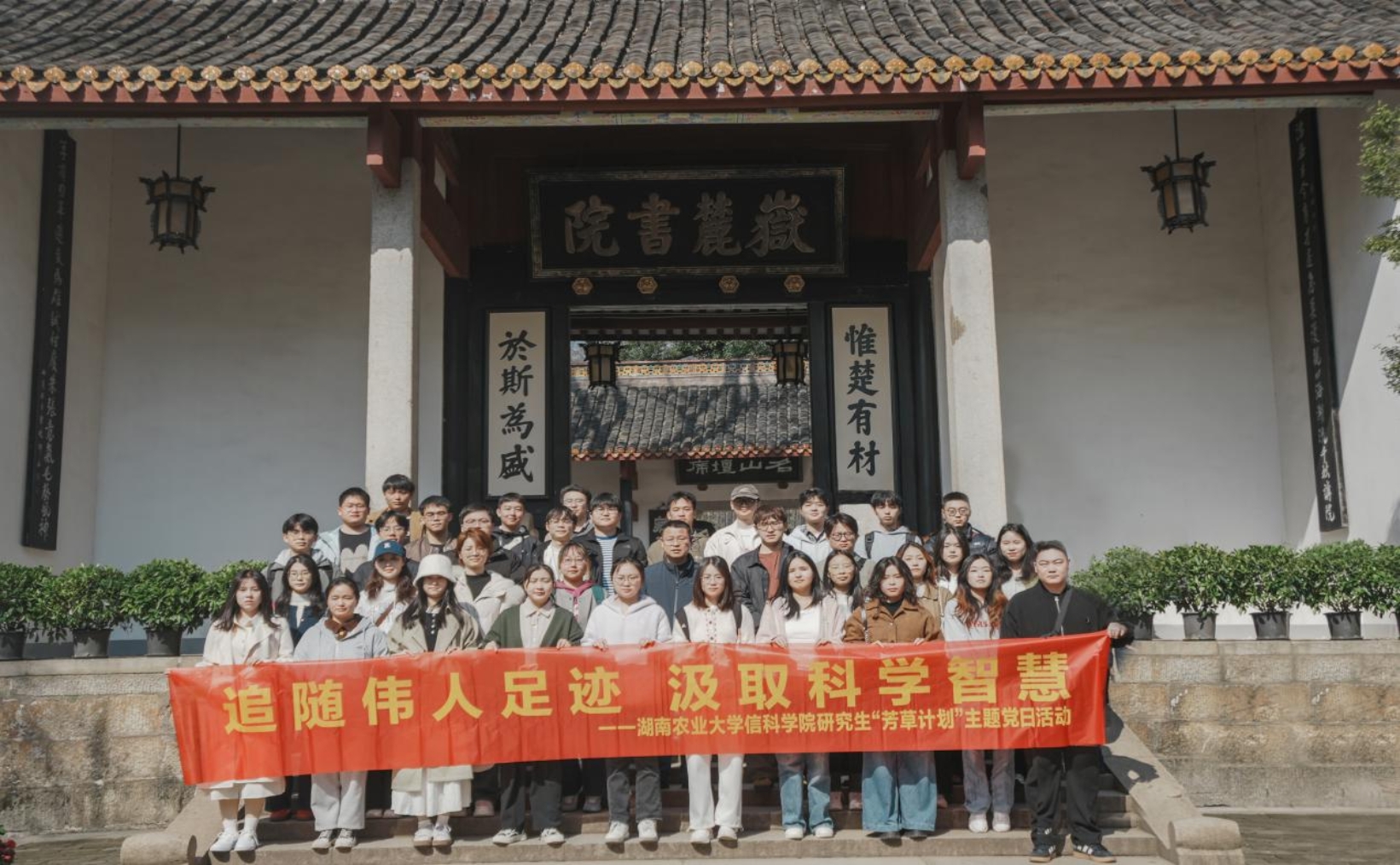 本网讯(信科学院 刘玉婷)为深入贯彻落实习近平新时代中国特色社会主义思想,教育引导广大研究生基层党组织和团学干部深刻感悟中国共产党百年征程的波澜壮阔与百年初心的历久弥坚,勇担新时代赋予的历史使命,3月19日,日韩无码一区二区三区研究生党支部在岳麓书院开展了“芳草计划”研究生主题党日活动。此次活动共有36位同学和一位带队老师参与,以游览岳麓书院为主线,旨在通过实地参观学习,实现团队建设和文化熏陶的双重目标。