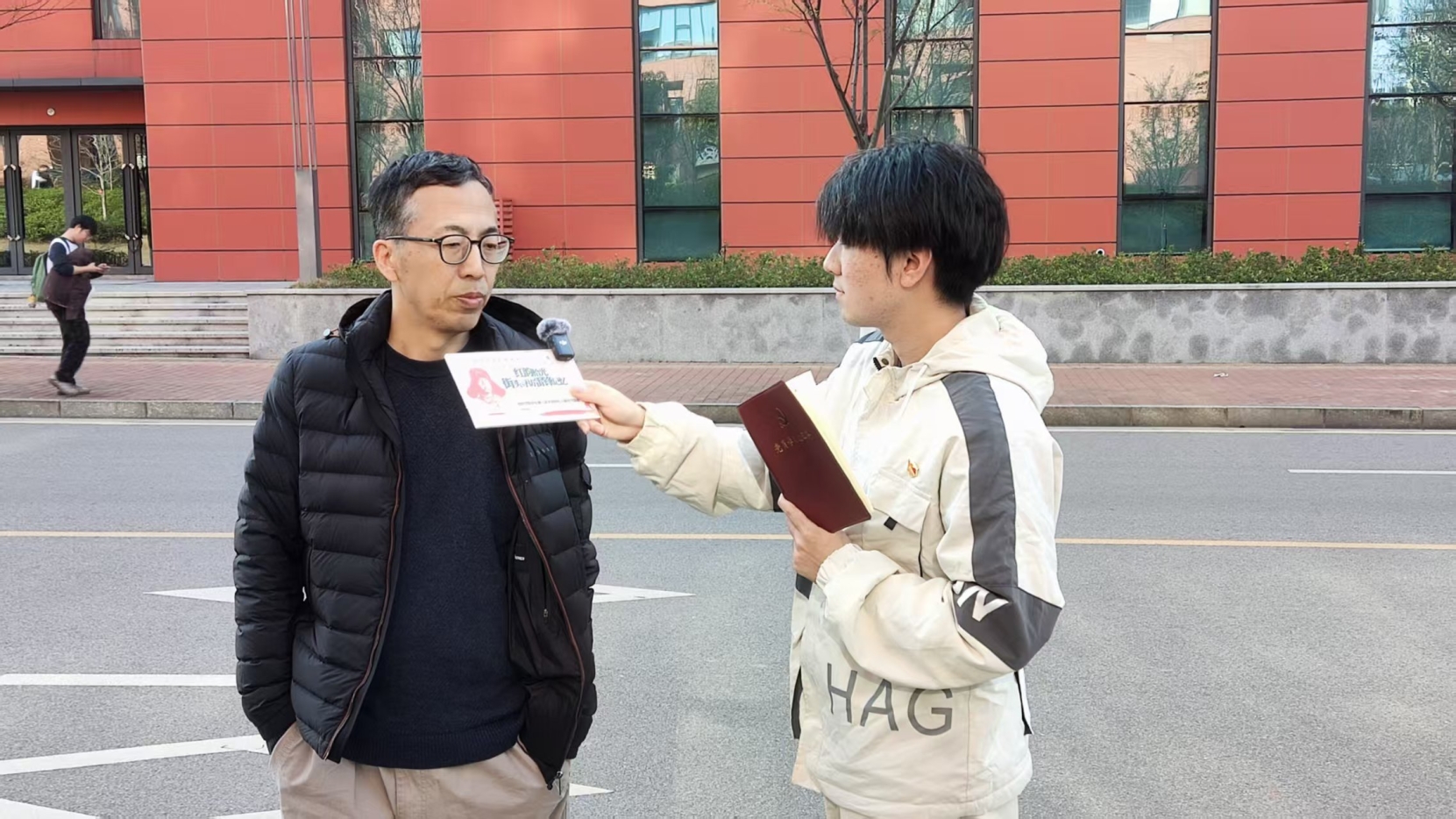 活动伊始,学生党支部书记陆玉婷老师对全体党员进行指导,明确了街头采访活动的规范与要求。任务分配完成后,学生党员们化身新时代雷锋精神宣传使者,穿梭在校园每个角落,展开了一场关于雷锋精神问答的接力寻访。本次活动通过街头采访、影像记录、互动宣传等形式,从教学楼到寝室楼,从田径场到修业广场,采访了不同身份、不同年龄的湘农人。受访者们不仅展现出对雷锋精神的深刻理解,还在采访最后纷纷表达了自己对责任与担当的思考。其中,一位教师说道:“愿雷锋精神永续传承,望青年一代勇于担当,既要做雷锋精神的解码人,更要做时代课题的应答者。”