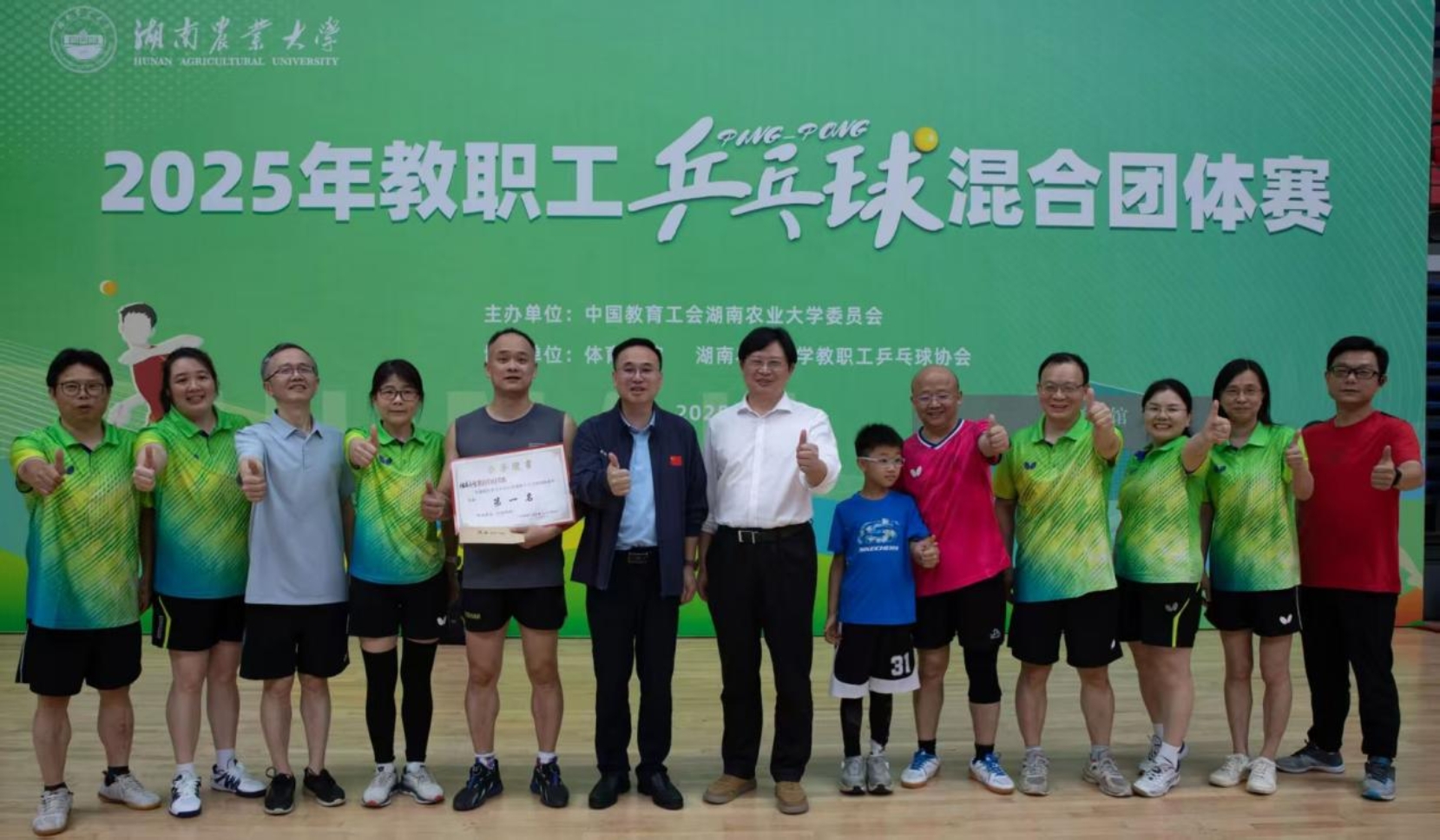 本网讯(信科学院 张香芽)5月24日至25日,由校工会举办的2025年教职工乒乓球混合团体赛在我校体育馆开赛,共有来自全校27个单位近300名选手参赛。我院教职工代表队由谭泗桥、黄正军、许建开、符国庆、曹晖、罗帅和张香芽等7位老师参赛。经过一天半的激烈角逐,凭借顽强的斗志和精湛的球技,成功卫冕,再度将冠军奖杯收入囊中。